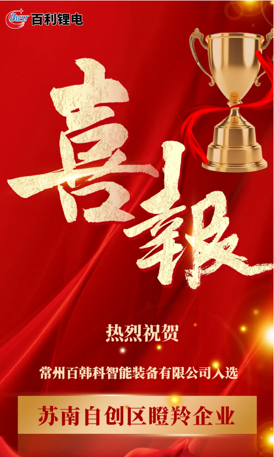 江蘇省生產(chǎn)力中心發(fā)布了2023年江蘇省獨角獸企業(yè)、潛在獨角獸企業(yè)和蘇南自創(chuàng)區(qū)瞪羚企業(yè)評價結(jié)果,百利鋰電旗下子公司常州百韓科智能裝備有限公司入選“蘇南自創(chuàng)區(qū)瞪羚企業(yè)”!